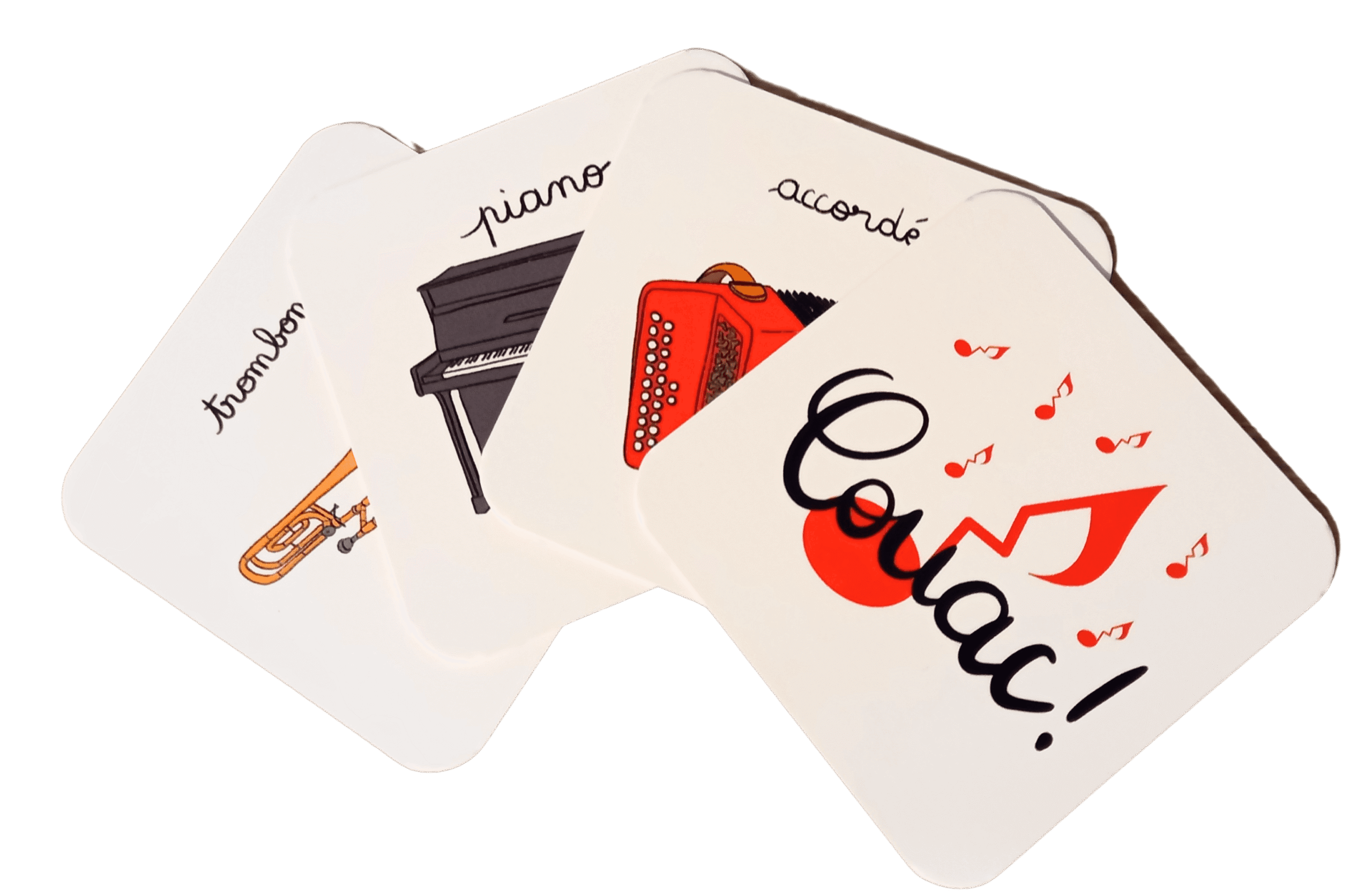 Découvrez « Le Couac » le jeu de cartes musical coloré issu de la collection Manuka & anoly’s inspiré des dessins du livret de « 30 Jeux pour l’éveil à la musique » ! Collectionnez les paires d’instruments de musique illustrées, tout en évitant le mystérieux « Couac! ». Jouez au memory pour apprendre en vous amusant !